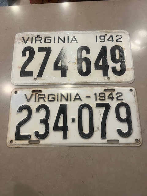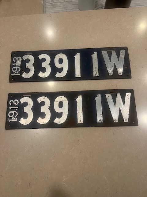 Nice pair of 1913 Wisconsin plates $275. Pair of 1969 New York plates, very nice $75.00. Pair of 1964 Ohio plates, Very nice, $35.00. 2 single 1942 Virginia plates, $20.00 each. all plus shipping. kdmks AT att.net.