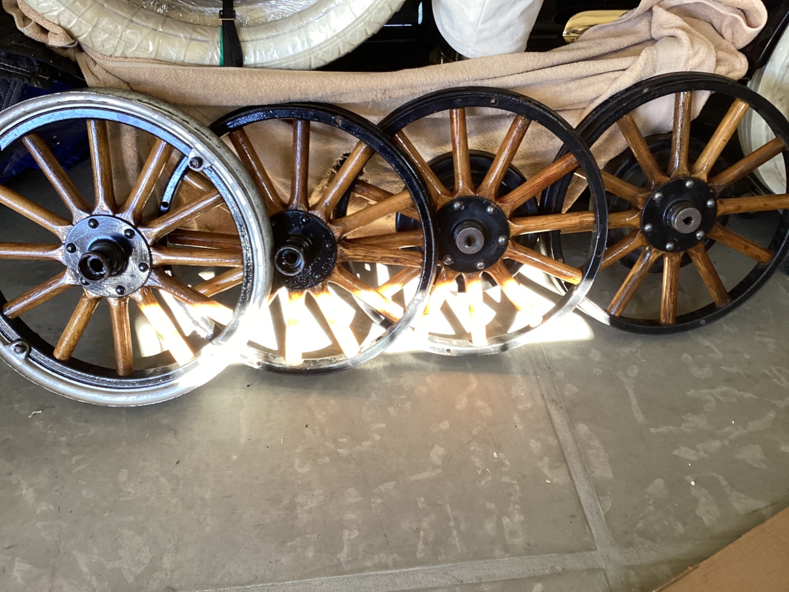 For Sale - I have four 19” demountable wheels with back brake drums. There are three Firestone 4.40 4.50 21” 4 ply almost new tires, no cracks and hold air, made in the USA. There are also two spares that are not mounted, same size, different brands. Some of the wood spokes have some cracks, I bought them like that, but I have been driving on them close to ten years and they haven’t changed, nice and tight, wood is solid, ready to mount and drive away. Rim nuts and bolts if you wish, the two spares do not have inner tubes. $550. Plus the ride to you. Frank