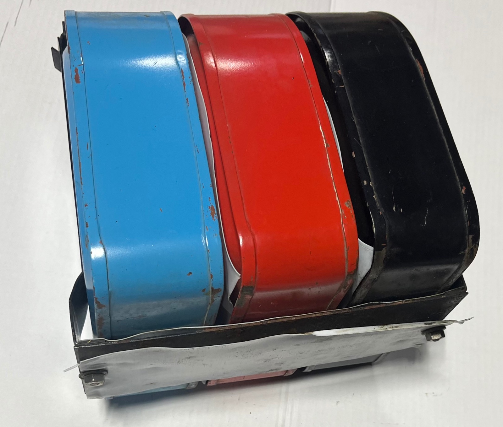 Reproduction Set of 3 containers with Running Board Holder that allows transportation of Gas, Oil, and Water. Mounts on the running board. Made so a padlock and secure the 3 cans in the holder. Never used but could use new paint. White plastic dividers can be seen in the photos. $375.00 plus shipping Lang’s 1-800-872-7871