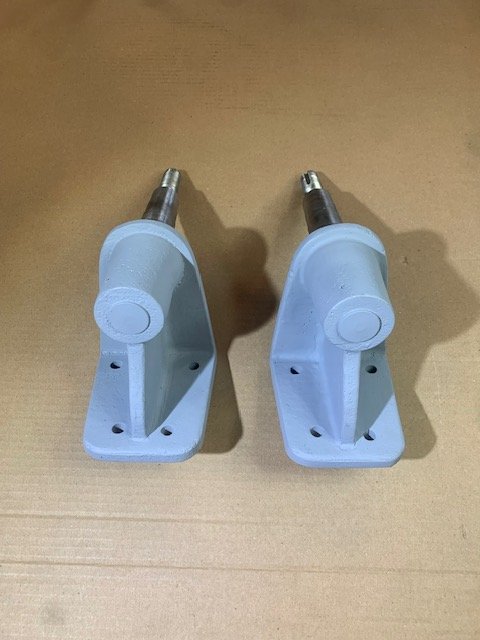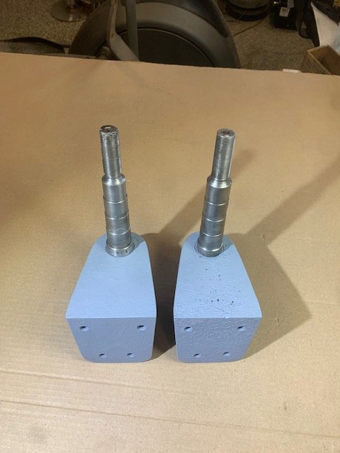 For about forty years I have had these very unique spindles. They were mounted to a beam with T front wheels on. They are, nicely machined to spec, T front left and right thread spindle shafts made for this specific purpose, and are cast into a robust aluminum bracket. I have no idea who made them but I am impressed with the quality of manufacture. They probably should be mounted to a plate that is then attached in correct alignment. $500 plus shipping