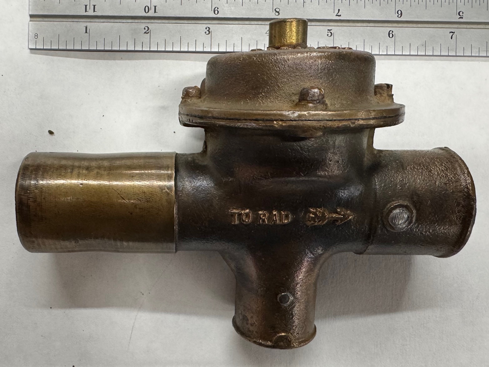 Very cool accessory thermostat. Looks to have some sort of diaphragm attached to some flaps that direct coolant one way then the other. Made of brass- this would look great on a period speedster or in the display cabinet.
