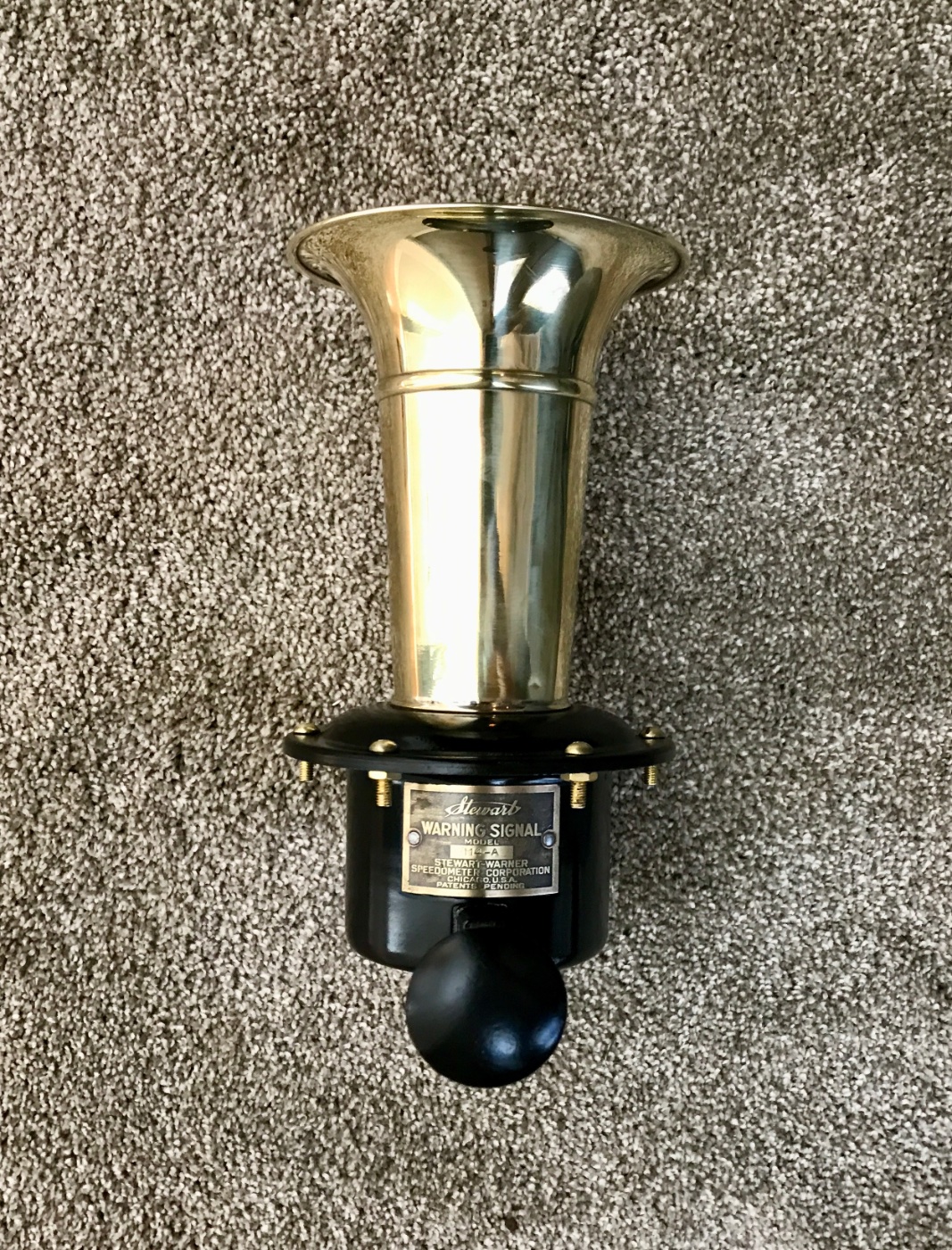 Original polished brass Stewart Warner horn. Excellent condition. No damage or dents in bell, emits a very loud “Aaaaawhooo!” When hand plunger is depressed. Beautiful horn, ready to mount and use. 300 includes shipping.