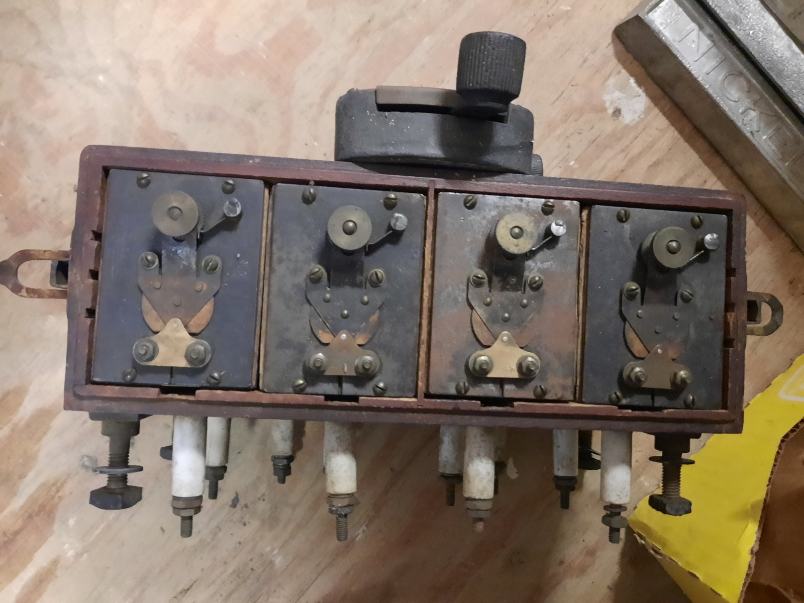 The coilbox with Corbin "lunch box" type latches are from 1913, as the Heinze coils in the box. The Upside down switch is KW.