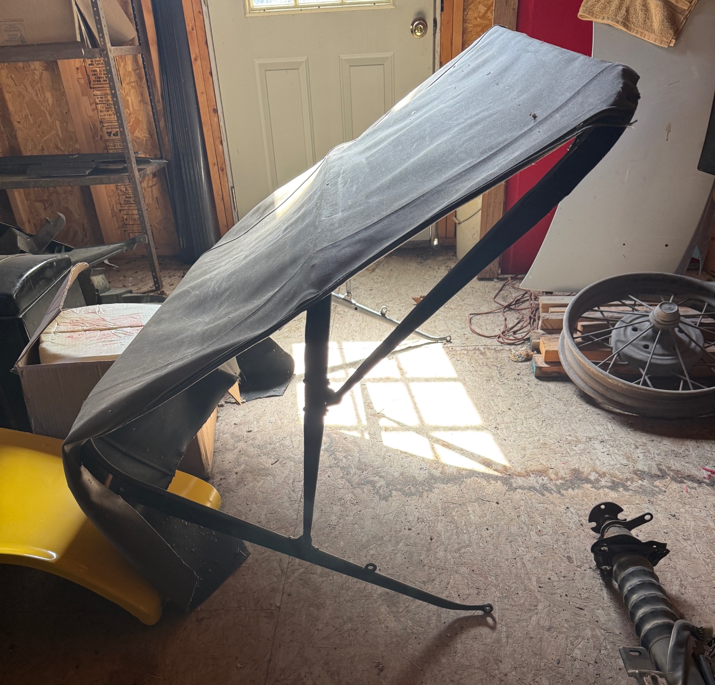 I have one that is available. I added the tan canvas as a quick way to add some shade when I had my granddaughter out on a summer trip. It is just tacked on. I have a 25 roadster that i had it on for a few months until I found the correct one for my car. A friend found this at Hershey for me thinking it would fit my car. I did cut the front bow in order to get it to fit my windshield frame. I’ve got $550 in it