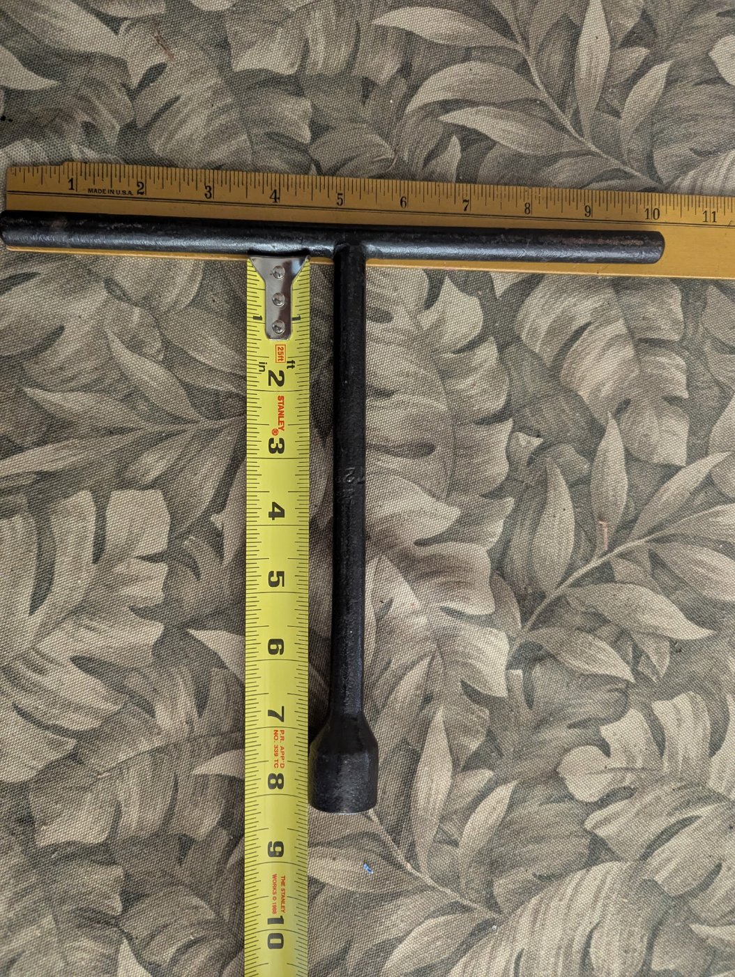 You could make a very similar tool by cutting down a Wal Mart 4 way lug wrench. W-M offers an inexpensive 4-way that has a socket that fits the T lug nuts well. I carry one in my T along with a lightweight W-M scissor jack. From the socket ends to the center of the 4-way measures 8", like the original, and you could make the handle portion 10" like the original, or longer if you wished.