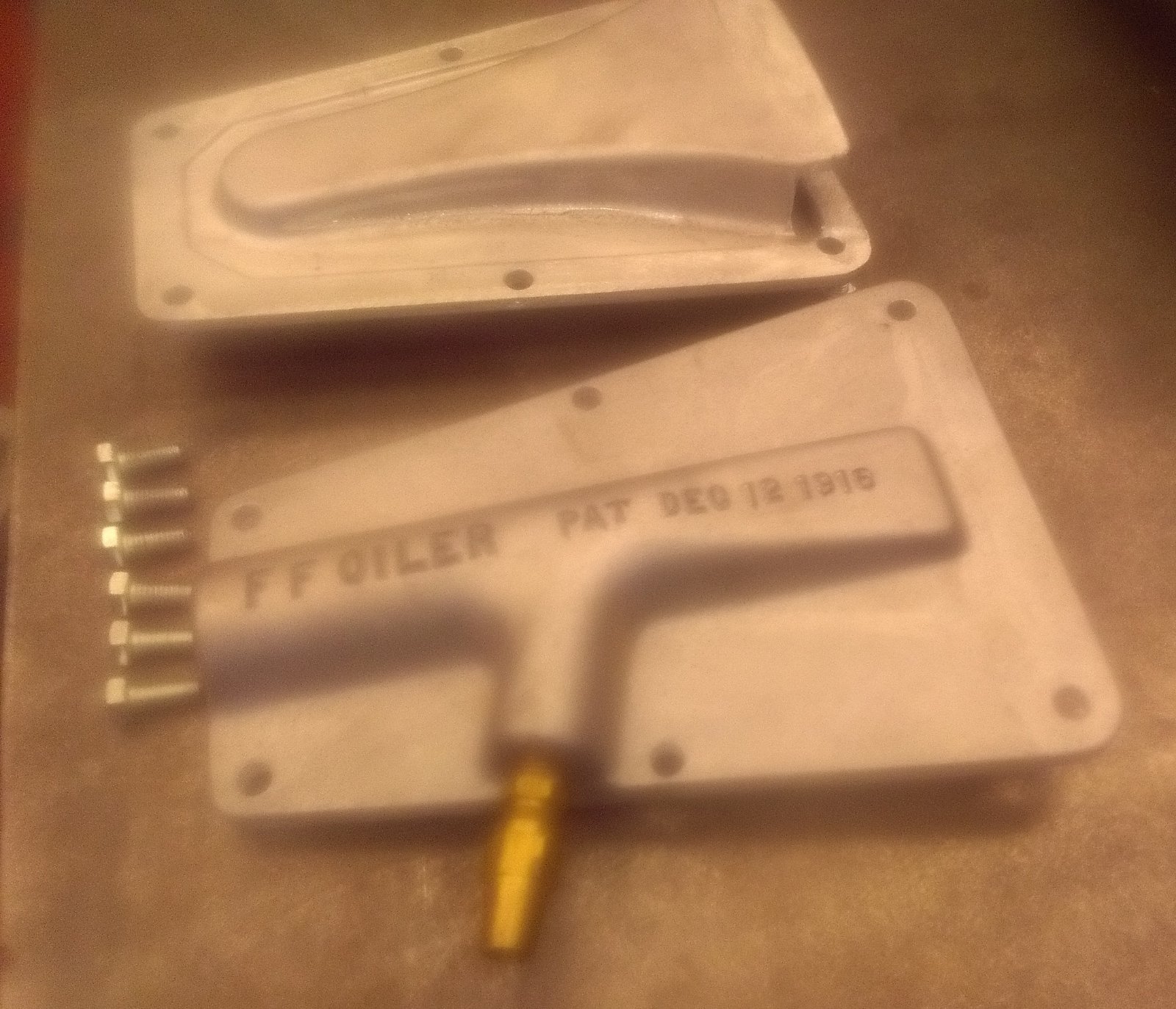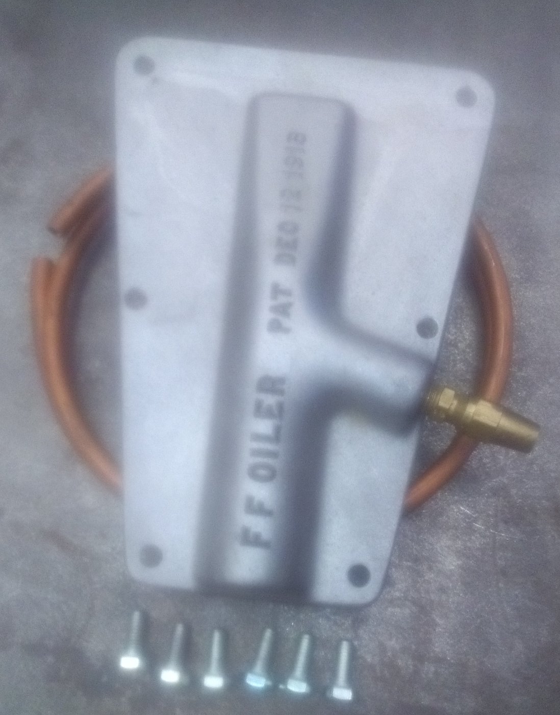 The F&F Oiler is similar to the Ford Faithful Oiler, but only uses one gasket to seal it and is cast aluminum rather than stamped steel.. These were recently discovered in storage from a long time T parts manufacturer. A set includes the cast aluminum cover plate, the outlet fitting that attaches to the front bottom of the pan inspection plate ( your choice of either 3 or 4 dip pan), the copper tubing, tube fittings and 8 mounting bolts. Price is $100.00 /set plus $15.00 USPS priority mail shipping in the US. I only have a limited number of these and once they are sold there will be no more. Either a PM through the forum or an e-mail to dmcgearsATyahooDOTcom with your shipping address. Payment either check or F to F Paypal. Thanks