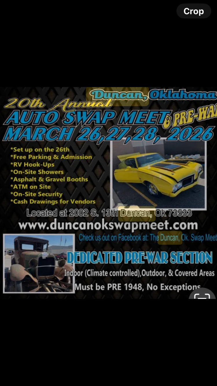 There will be T parts and other pre war stuff at the Duncan Oklahoma swap meet. They added a pre war section last year. Us in the Midwest need to support this to keep a pre war swap meet in the area. I will have a booth and plan on bringing wheels, horns, tools, plates and many other items. Photos coming. Attached is a flyer. I went last year if anyone has questions.