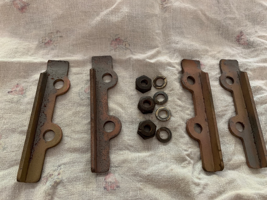 These are the brackets that hold the windshield to the dash on the two piece dash. These are not reproductions. Reproductions are all brass and a little shorter than these. These are steel that were brass plated. All the brass finish is gone. These would need to be re-plated.