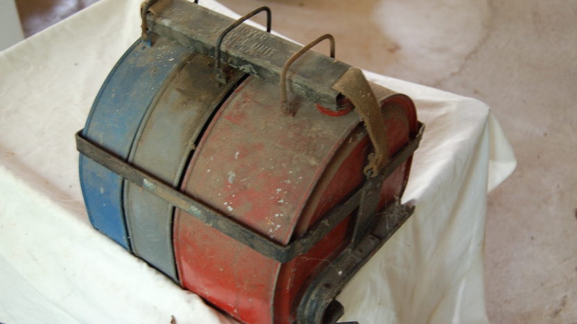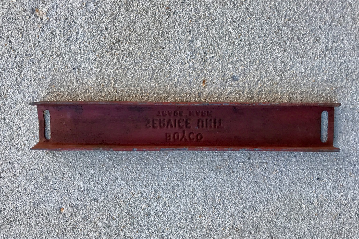 Very hard to find original running board can Boyco Service Unit hold down clamp. This would rest on top of the Boyco can lids, and straps would hold it in place. 12 inches long. Stamped steel. 60.00 includes shipping.