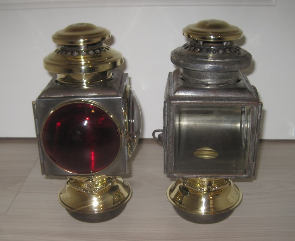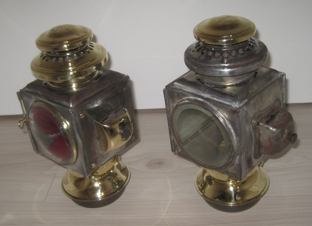 For Sale: One "Black & Brass" E & J "1908" tail light, refurbished, and one E & J "1908" side light, refurbished. The tail light is ca. 1913 - 1914 but has a 1914 style fount, which I can swap for an earlier one if needed. The side light is a transitional 1914 light, with features in common with both the earlier "1908" style lights and the later "Model 32" lights. You don't see a lot of these. The tail light is nice but has a few flaws, there are some dings in the brass parts and a bad spot on the reflector. The lenses are reproductions. A burner is included with this light. The side light does not have a burner with it, but is mostly original except for the fount collar. Both lights have been stripped to bare metal, with the brass parts polished. Asking $185 for the tail light and $165 for the side light. Buyer pays shipping. Thanks for looking.