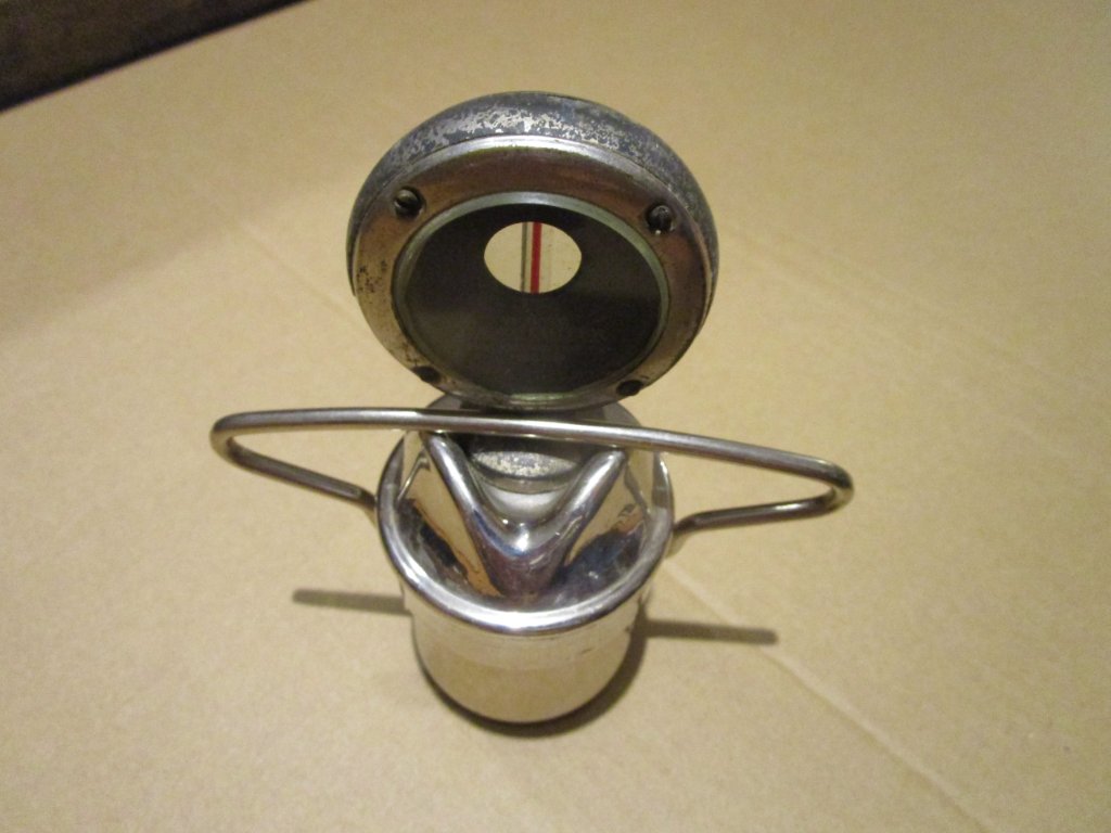 I will show a few pictures of a cap with an old moto-meter from my collection, fit to a radiator neck. It is not for sale. I just show it for illustration purposes.