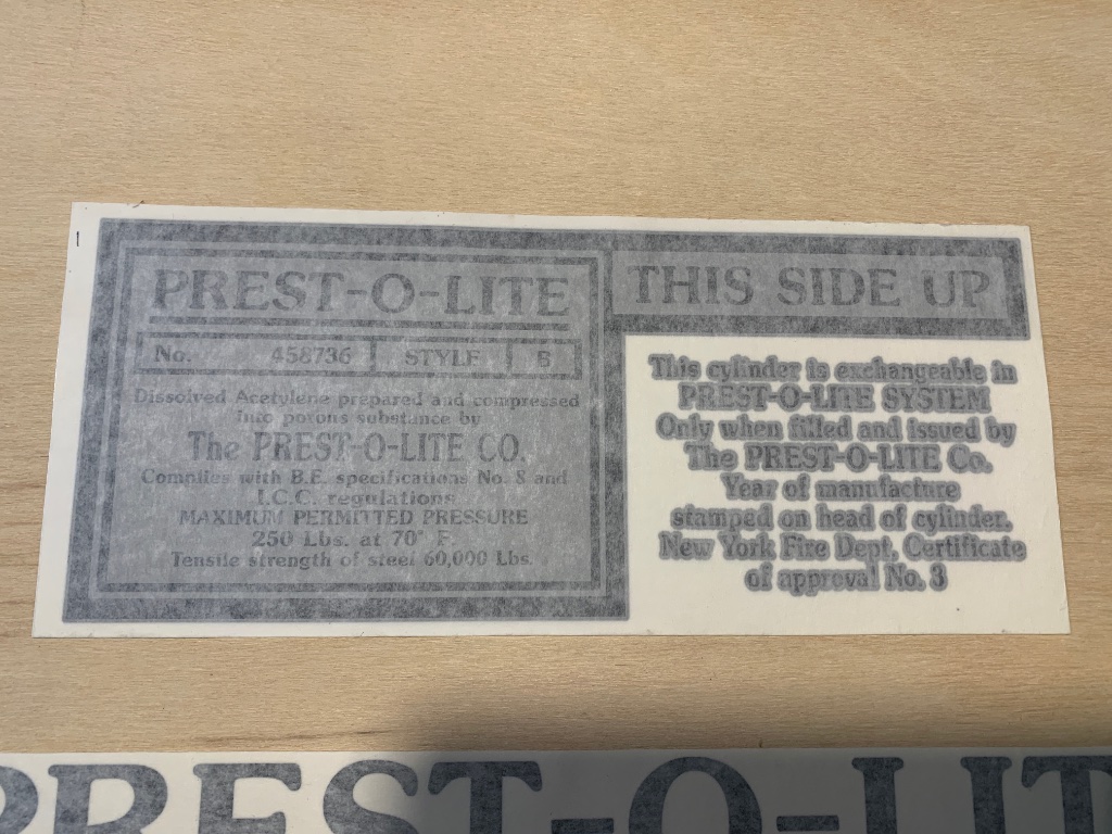 Here is a brand-new decal never been mounted for an early prestolite tank. This comes with two decals. 1 is the the main decal that has all the information and the second is the long prestolite logo.