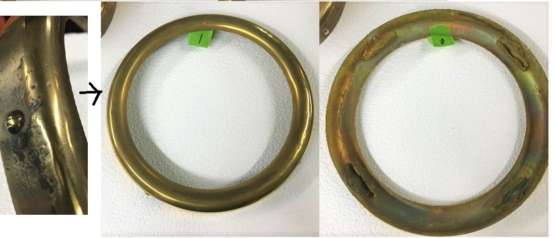 Each rim is Ford scripted, brass, will have minor dents, good clips for lenses. These were all originally Nickel and just a slight trace around the rivet creases $30 each + shipping