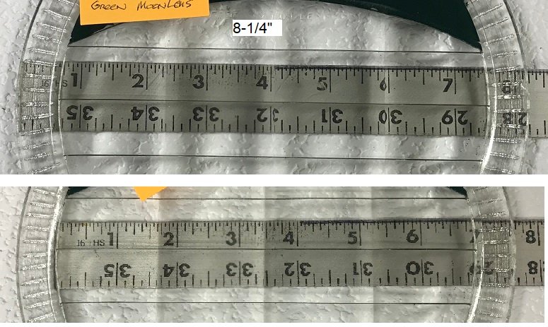 NOT sure if I still an 8-5/8" is likely for the mysterious large headlight bucket. Fitment requires the early headlight rims that have a small clip as opposed to the broader H style. Some T hobbyists may have had the edges ground to fit the later style rims for the H lens. The 8-5/8" rim will not fit a standard rim the inner ridge is wider than it opening. May be for the so call large headlight . This lens has a hooded eye lid.