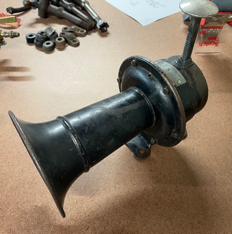 Mid to late teens Stewart Warner hand operated Horn, needs some adjustment for good sound, plunger does not return after pressed, you must pull it back up. It seems to have been built that way. Nice piece with a factory mounting bracket.