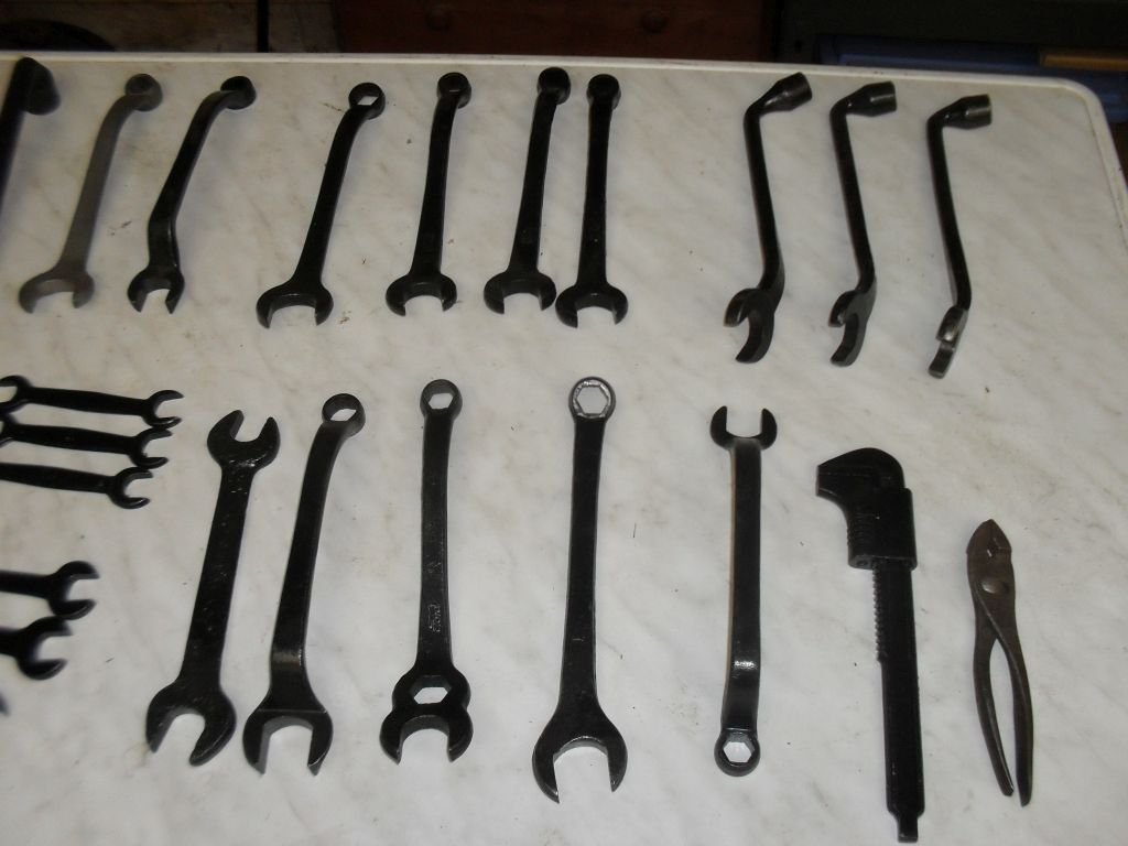 (5) T1917 (2) M (1) ford (2) M-40-7017 with difference spark plus sizes. (1)M-52-17017 (1) ford Pliers with screw driver handle (1) monkey wrench Model A I think. (3) knock offs not model T (1) grease gun with wood handle (5) sparkplugs wrenches (3) Walden wrenches. (10 crank and lug wrench. Name your price, I have had these too long.