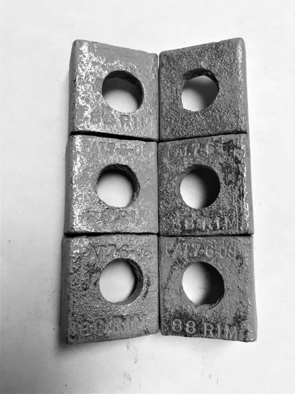 I love the appearance of these genuine parts. They are likely sheared off a length of rolled channel. Each one gets slight bends in the feet and often shear marks at the ends. Langs have filled a need for these, but they are CNC machined, and each is a perfect clone of the next.
