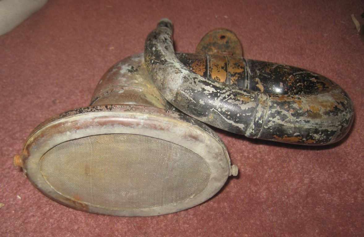 FS one very nice unrestored "Standard" brass horn, correct for 1914 (and possibly late 1913.) This horn has only a very small number of dents and the brass is very solid, it should be an easy restoration. The grille and screen are present and look quite restorable. The whole horn is covered with "Barn Find" Patina but should clean up very nicely. This is one of the nicest unrestored single-twists I've come across. Asking $145 + shipping. Thanks for looking.