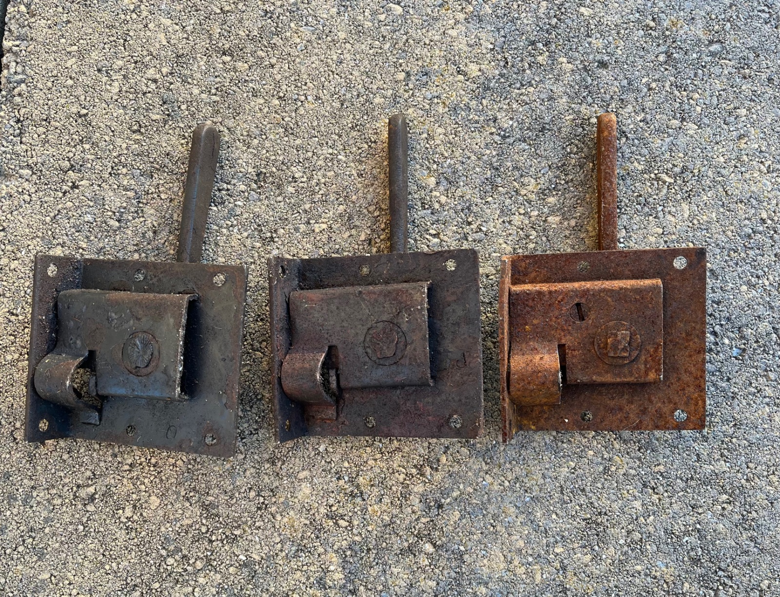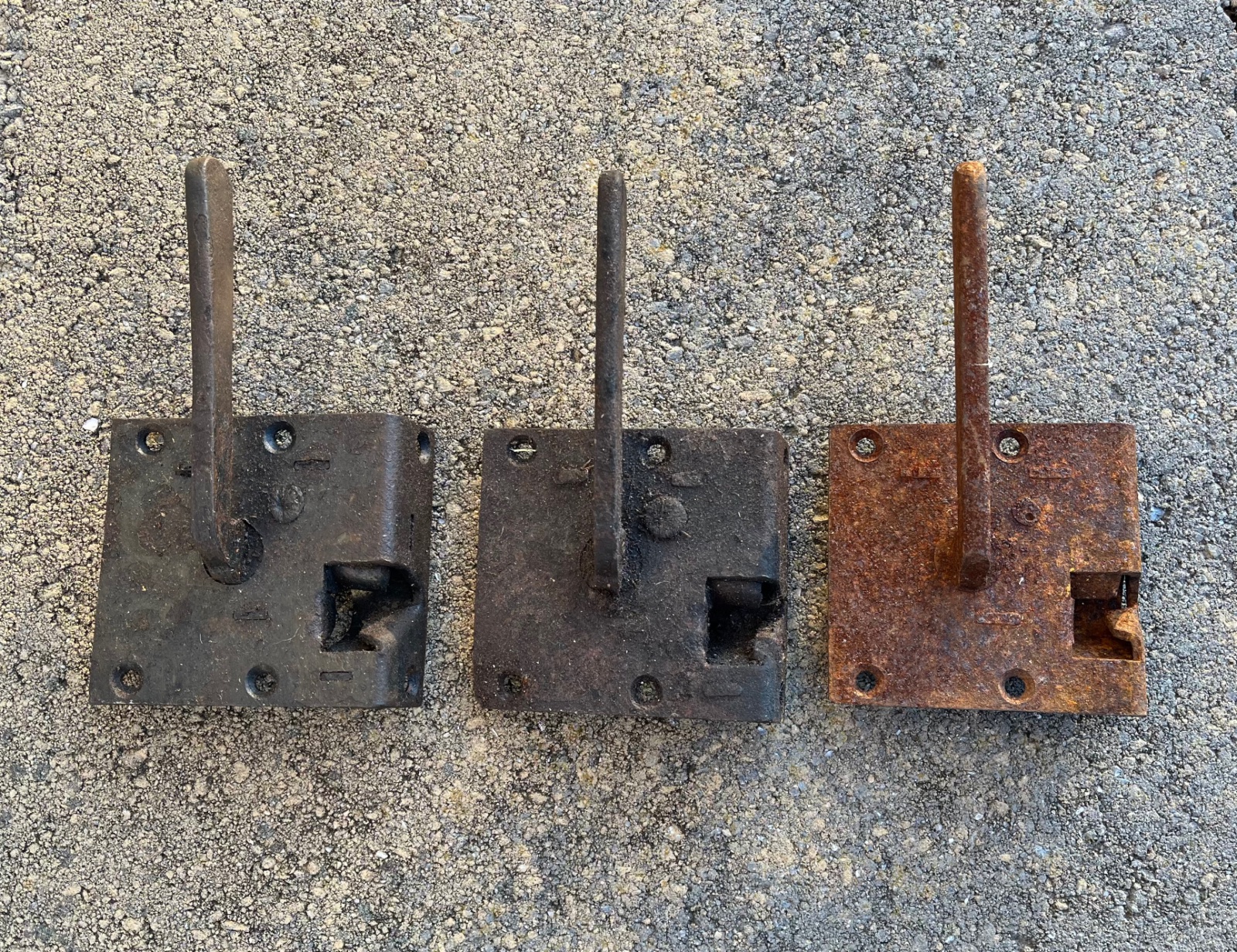 For Sale, three 1914-1916 door latches. All the same side. The rusty one is seized and the other two move freely.
