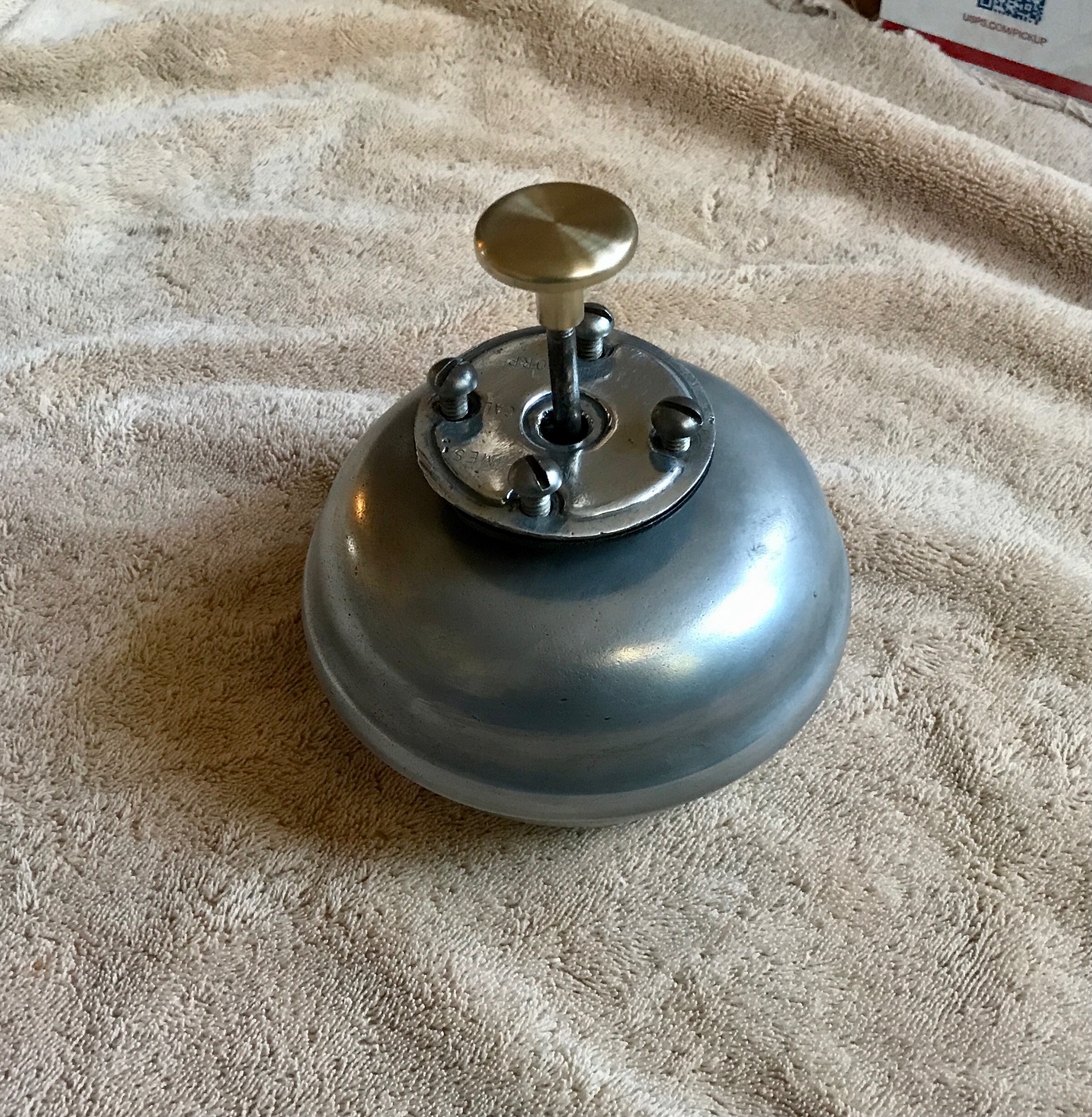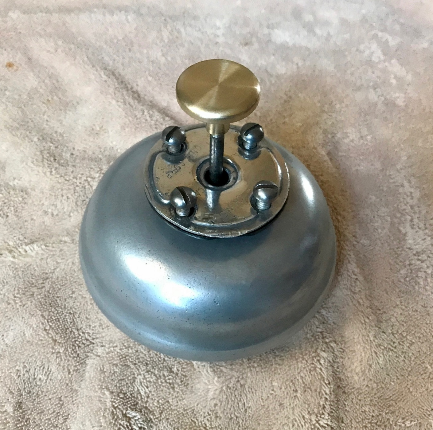 Vintage Tu-Tone Bermuda foot bell. This original aluminum Bermuda bell is in good working condition. It has a loud DING DONG when the plunger is depressed. The bell has a nice worn patina to it, with small road nicks, pitting and scratches from many years mounted under a vehicle. Works nice and is ready to mount under your steel or wooden floor boards. 200 includes shipping.