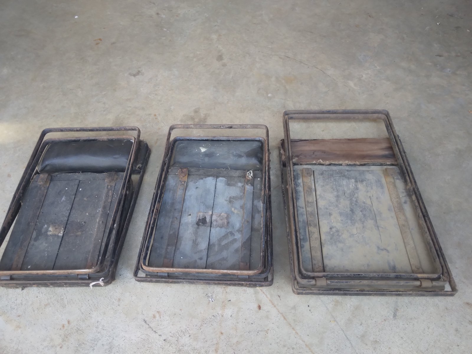 I have 3 model T era camping chairs for sale. They are a folding metal frame, wood seat and backrest, covered in leather. These early style fold up camp chairs are scarce.