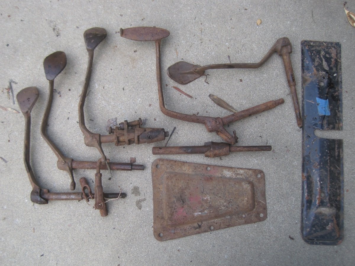 Left To Right: Misc Transmission Pedals, Smooth, $2 each, cams $1 each; 26-27 clutch pedal $5; transmission cover, $5; valve cover with hole cut in it $1.