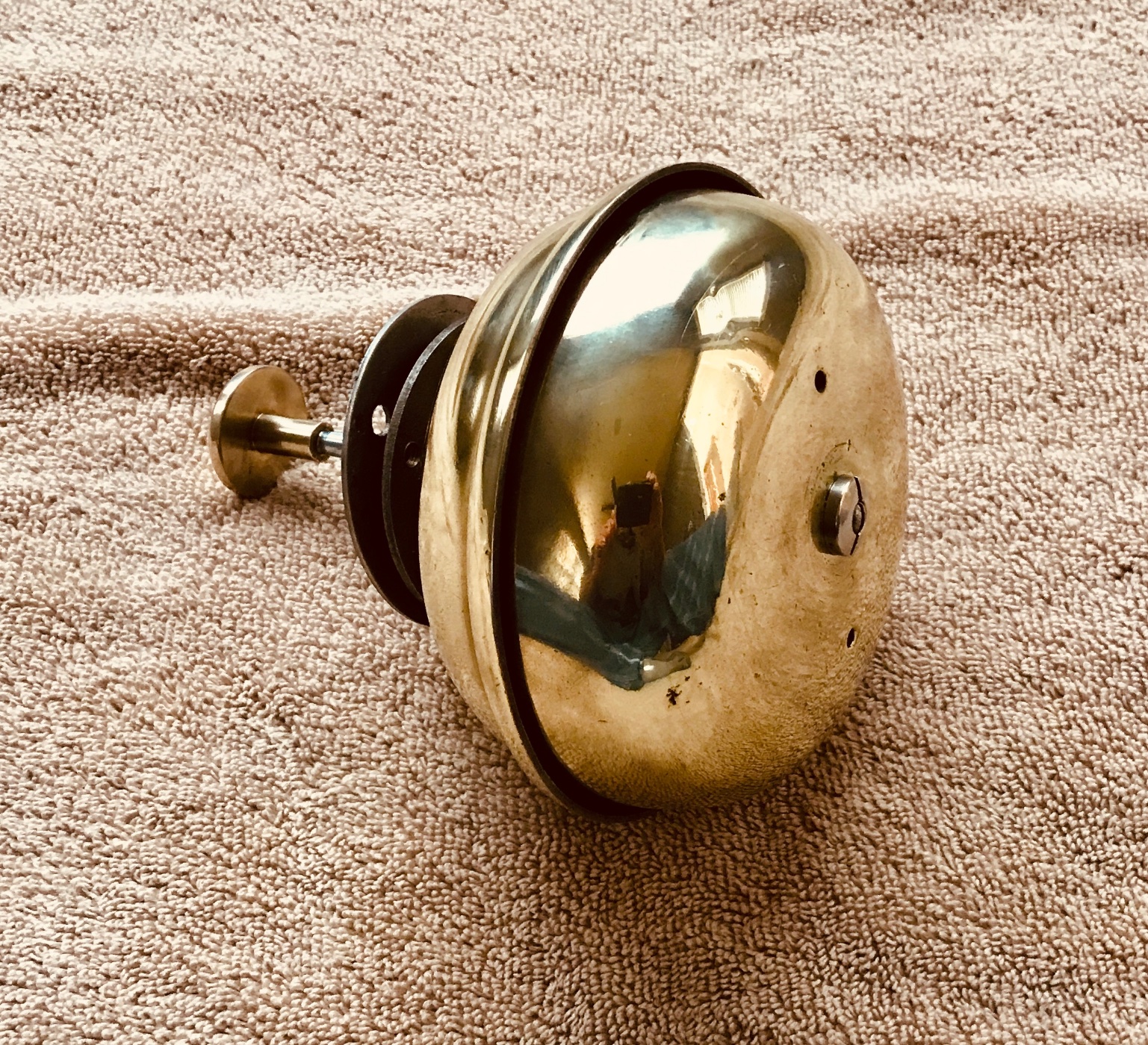 Here is an original early T-era heavy polished brass Bevin Bermuda Foot Bell. This bell is in nice working condition, with the polished brass bell showing minor road wear and small nicks and scuffs here and there, but no dents. Looks beautiful with just enough patina for a 100 year old bell. It mounts under the floorboards and produces a very loud “DING DONG!” when the foot plunger is depressed. 5-1/2 diameter. 275 includes shipping.