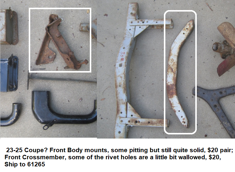Left to right: Rear Crossmember, 14-25, looks good $25; Front Crossmember, some of the rivet holes are a little bit wallowed, $20, 26-27 Fan w/ outlet, the fan has some fatigue cracks, $15; 26-27 Spare Tire Carrier missing one arm $20.