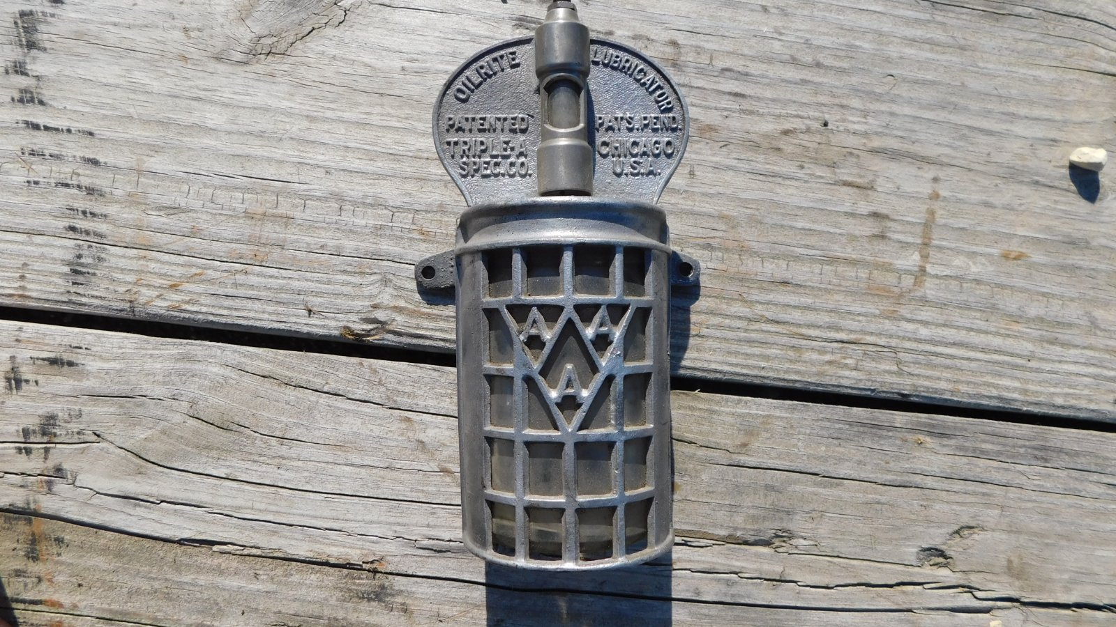 I think it is NOS. Very nice, the writing says oilrite lubricator, patented, pats pend, triple A,spec. co. Chicago, USA. I think it is cast aluminum? Has the original glass jar. $65+ shipping. NO TEXTING five07458677eight.