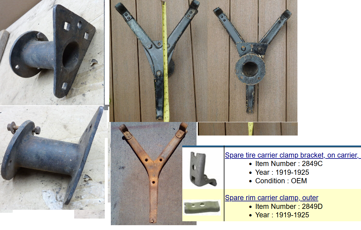 Looks much like these parts for 26-27 carrierrnwilliams wrote: ↑Thu Mar 07, 2024 2:33 pmHere is a picture of the 1926 Express body with the spare tire carrier. I'm not sure how it mounts. There is a 2 x 4 sticking out the side of the body. I'm assuming that has something to do with it.