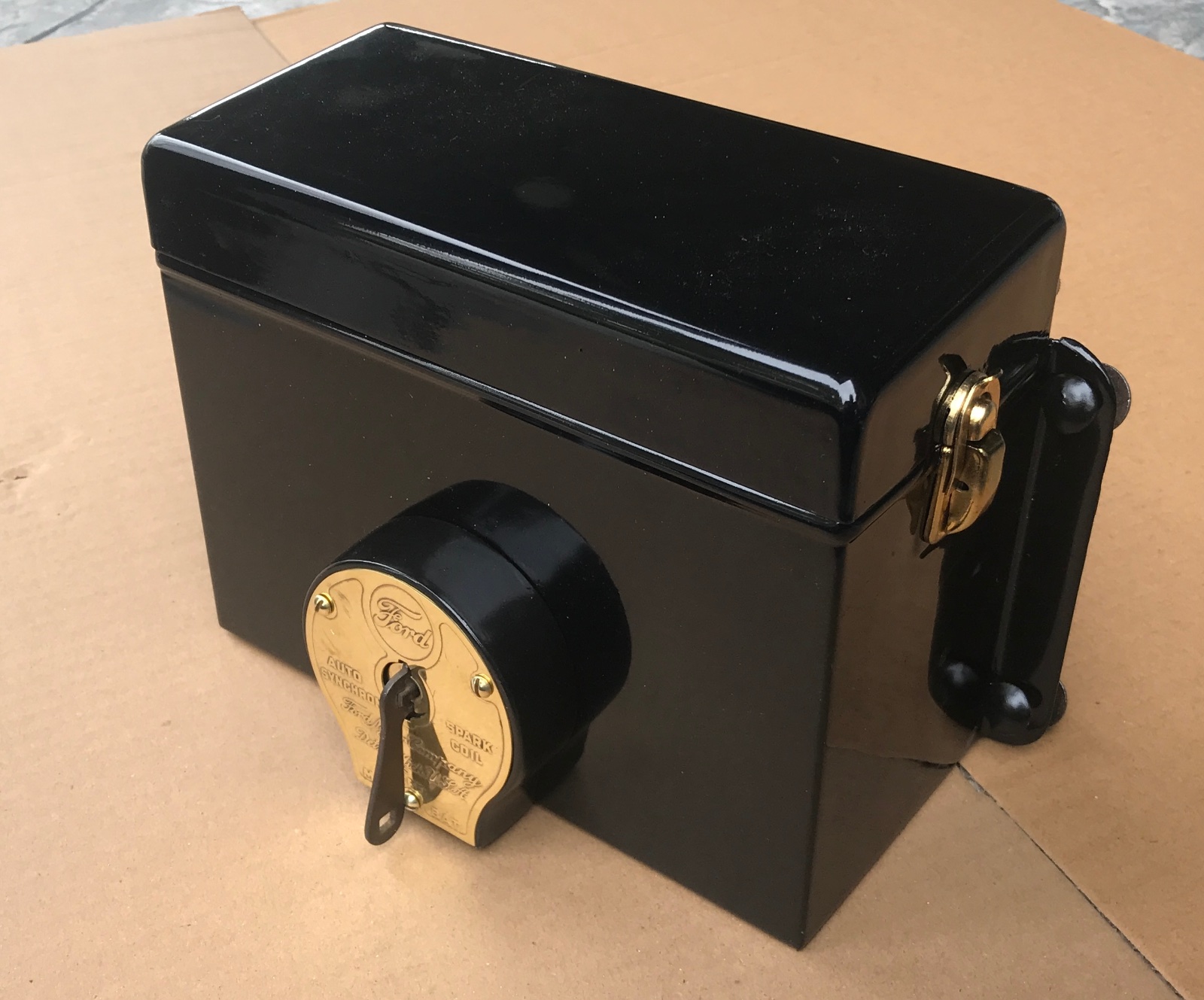 Nice clean late 1913-1914 slant cover coil box. Excellent working condition. Very straight. Nice gloss black paint,no damage, some very minor light scuffs here and there, nothing serious. Original switch and brass cover. Has newer wood and wiring. Original firewall mounting bolts. New latches, installed but fastening tabs not bent over yet. Includes key. 425 includes shipping.