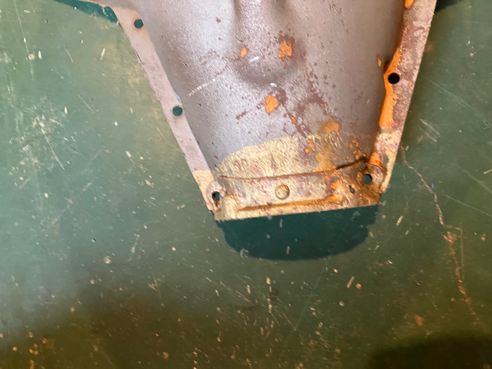 It has/had the reinforcement plates on the ears. Only 1 ear remaining. I’m including 2 ears from a 3 rivet pan that a person could modify. This is a very solid pan… no rust out. $500 plus shipping. I can ship via Fastenal or will put in a large box with garbage bag/spray foam around it.