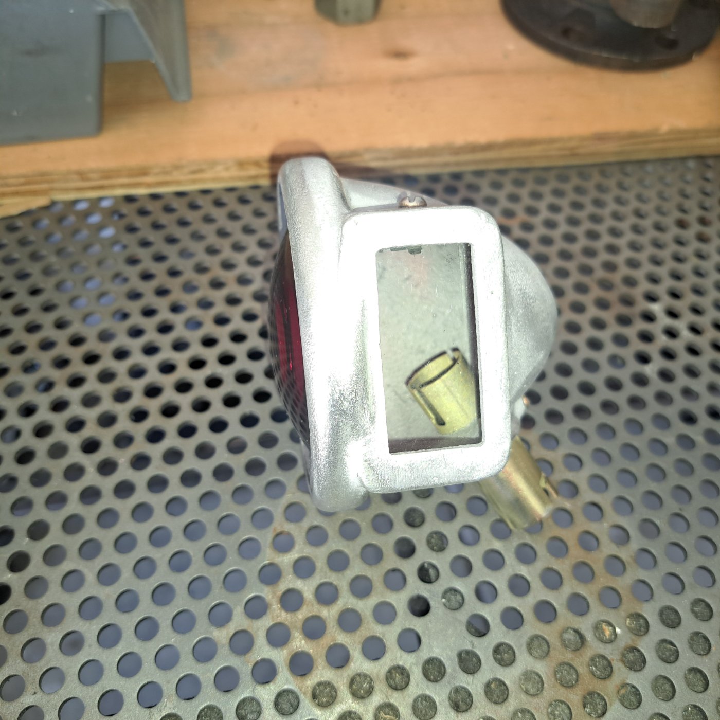 Neat cast aluminum accessory tail light / license plate light. Early round stake mount. Price is $30.00 plus $8.50 domestic shipping. Mark Chaffin (951)805 0928