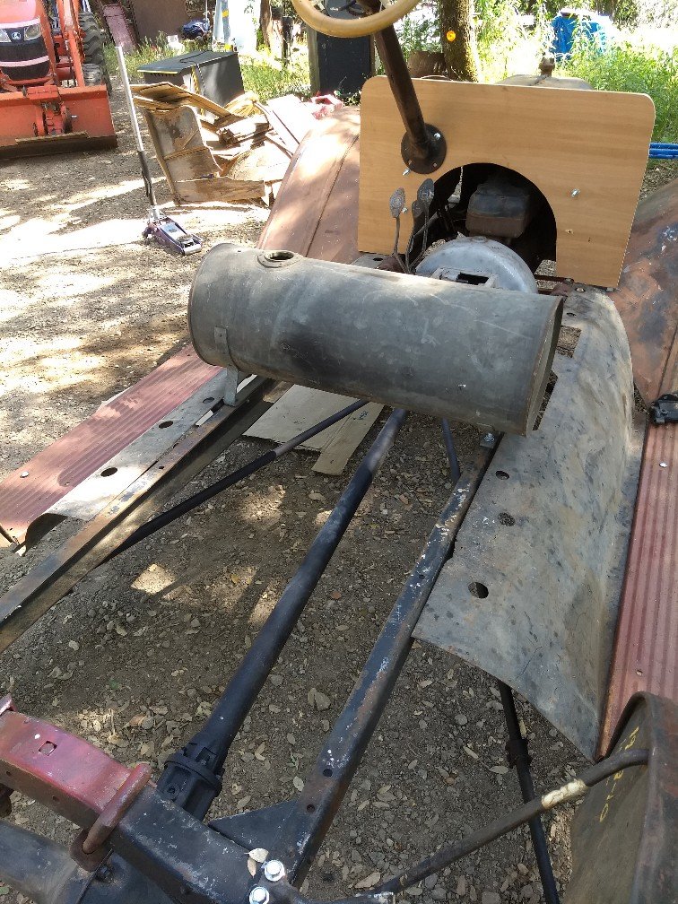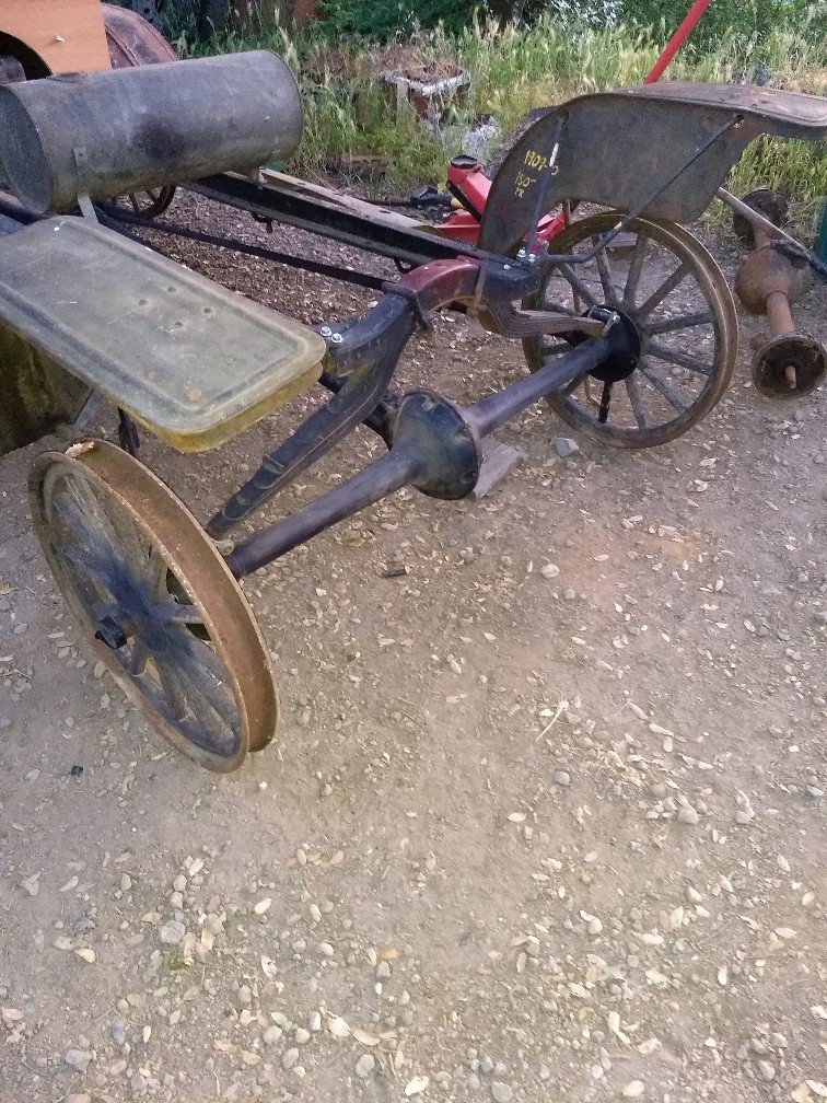 Rear end has correct strait axels with hubs that are pinned on. , Also found nice original 1909 gas tank, (shown in photo). Outlet is on the outside edge of the tank. Also have hogshead cover.
