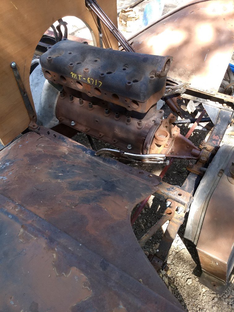 1909 chassis with correct engine block, head, timing cover, hogshead, pan, frame, fenders, running boards, fender brackets, steering column, rear end, springs, radiator, hood, firewall brackets, front axel, many original body parts for touring that was disassembled years ago.