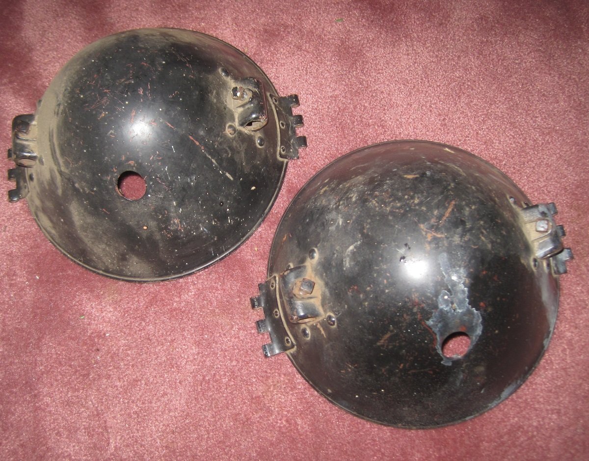 Free (You pay Shipping): One pair steel headlight buckets, probably ca. 1913 - 1917, early Nickel-Era. Diameter is 9", and the brackets fit a fork that is approx 7" fork spacing. All I have are the buckets, no rims, reflectors, lenses or bulb sockets for these. The hinges and brackets look like carry-overs from earlier brass carbide lights, which is why I think they are pre-1920, if not earlier. If you have a pair of these same lights that are rusted or badly dented, but otherwise usable, you are in luck. You pay shipping and they're yours.