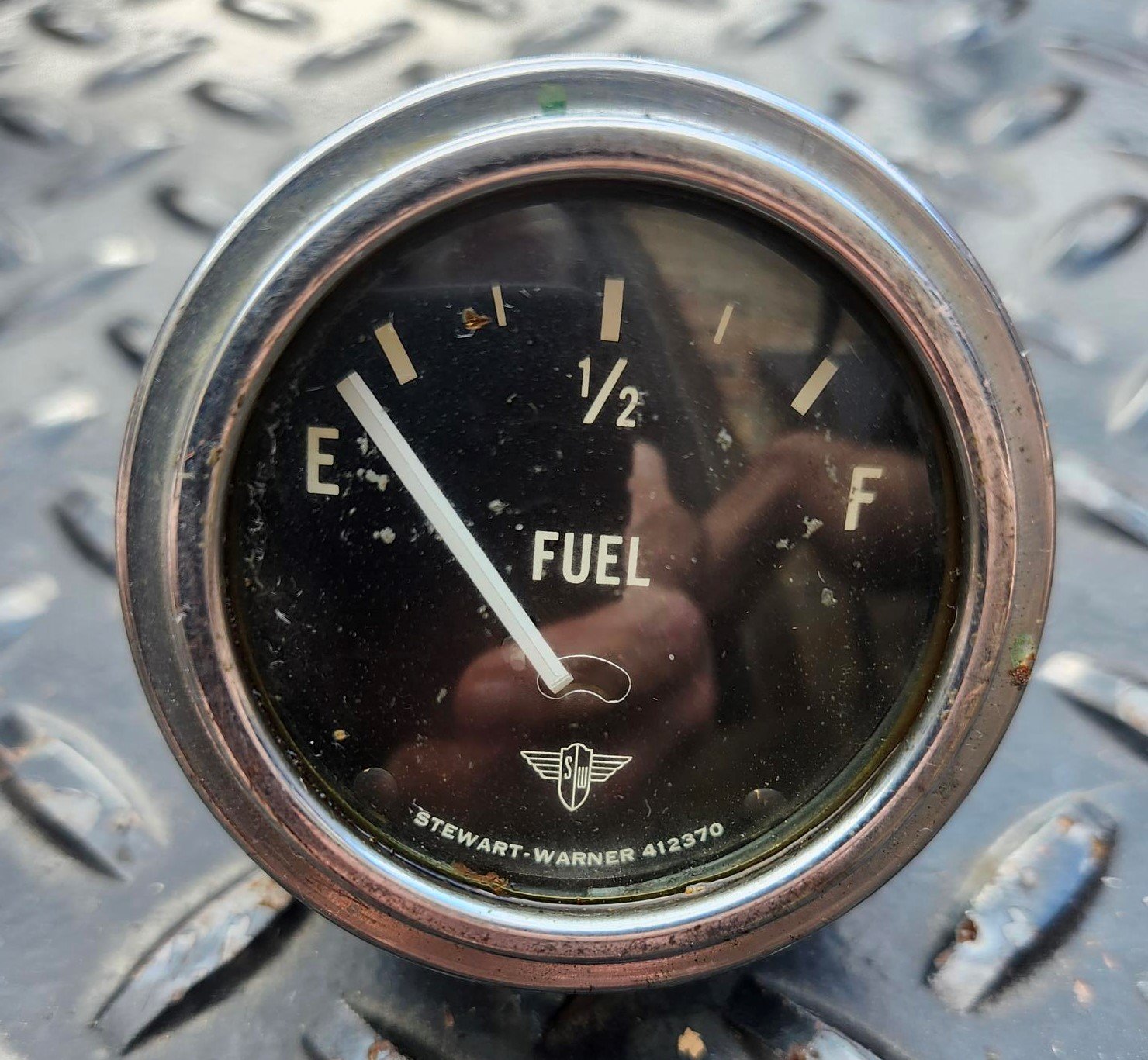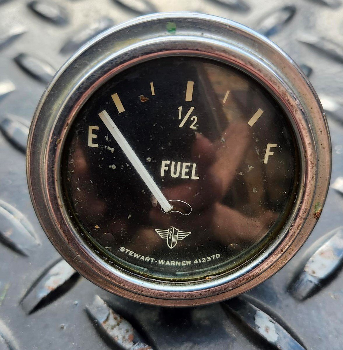 Here is a Stewart Warner Fuel Gauge. It is about 2 1/4" in diameter and has a curved lens. It is marked D358(?)E on the side, the other side is stamped S.W. INSP 53 and the back is stamped 6V. It looks great and might even be NOS. The lens has some dirt.