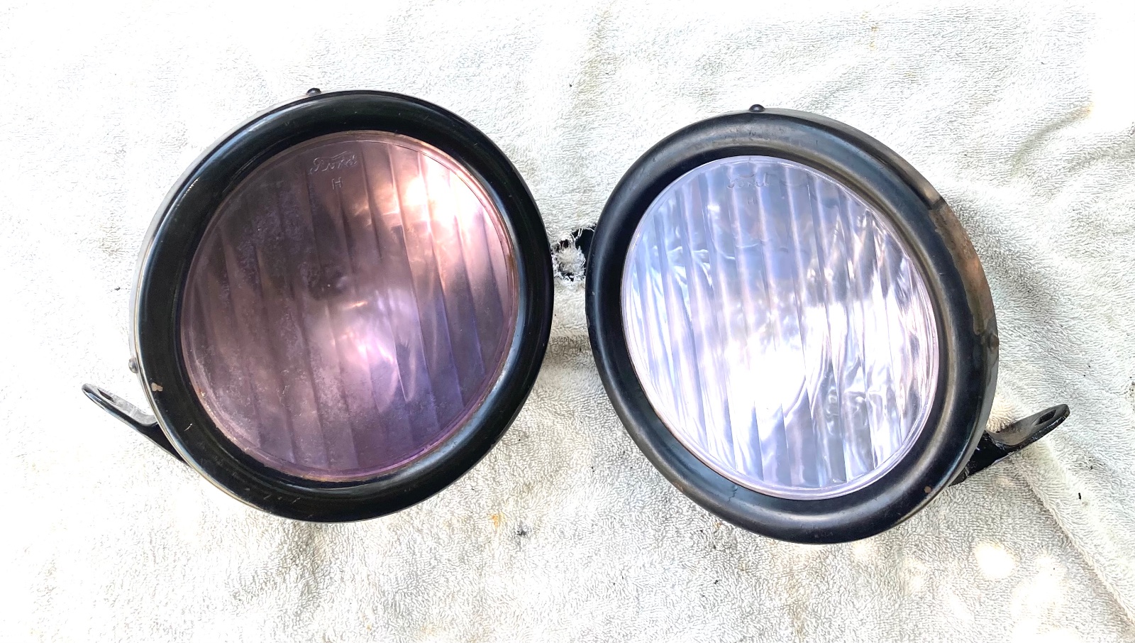 Just cleaning off a shelf since I’m turning to brass Ts. Nicely painted buckets. Rims could use a repaint. Original fluted embossed Ford ‘H’ lenses. One very purple. Other turning purple. Very shiny reflectors. Don’t know if silvered or chromed. Only $195 pr + freight.