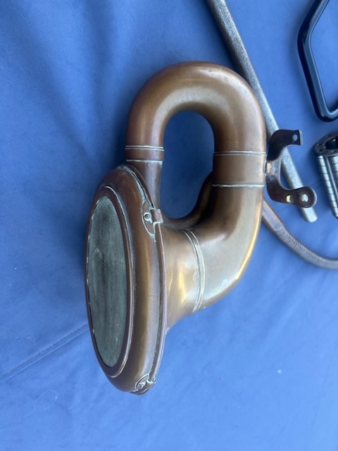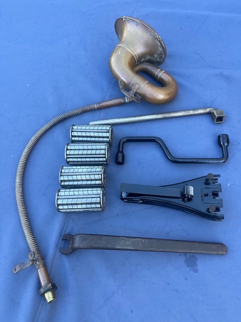 Nice brass horn and original tube, the bracket needs repair. $150.00. Transmission band tool, hold all 3 bands in place while installing washers and nuts. $75.00. 4 good bearings, $30 each. Ford 5Z210 flywheel cap screw wrench, $20. Ford 5Z156 main bearing wrench, $20. Blackhawk 4418X 5/8 9/16 wrench, $10. All plus shipping. kdmks@att.net.
