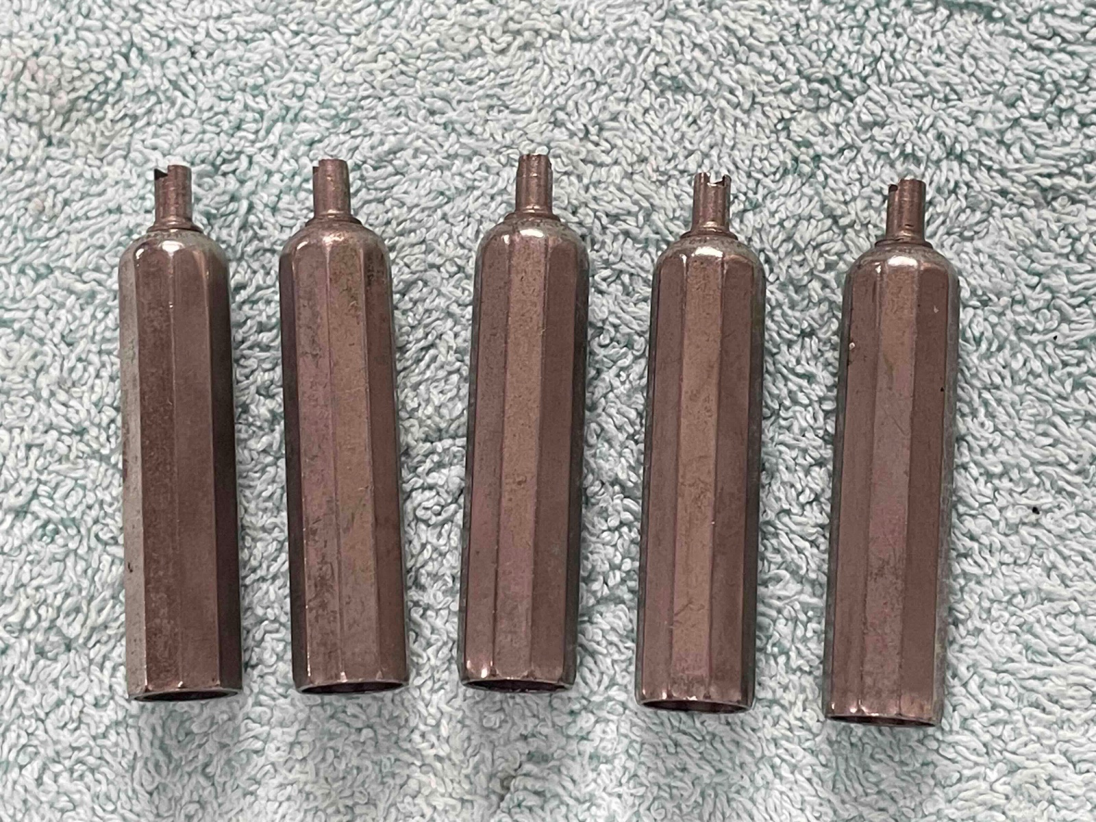 Set of 5 very nice Dill brand tire tube stem covers, these are made of brass and nickel plated.