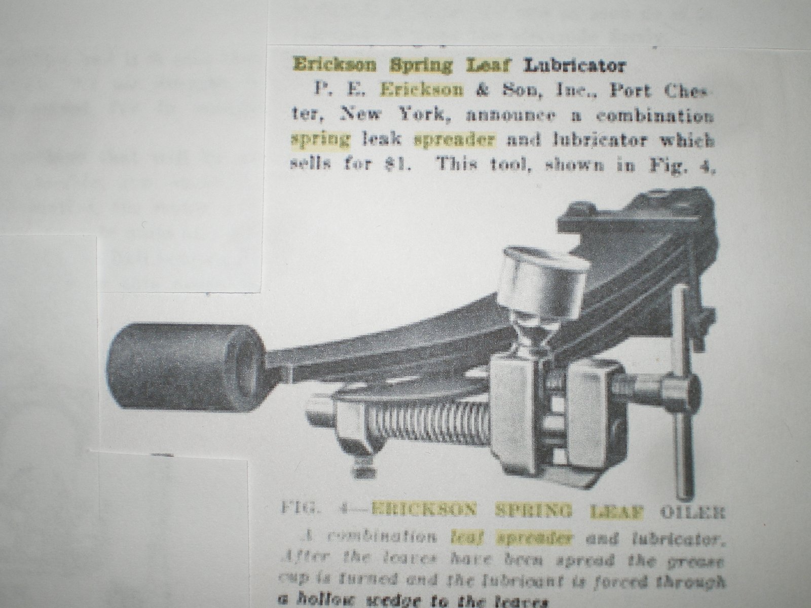 For Sale: Erickson combination leaf spring spreader and lubricator. Tool adjust for a maximum of 2-1/2 inch wide leaf springs. Spreads individual leaves on the leaf spring to lubricate between them. Requires graphite grease for the grease cup. Gives a smoother ride and helps maintain the springs for long life. Weight of vehicle must be off springs when using tool. Nice rare tool. Price $150 plus shipping. Call or text (248) 894-75fiveone. Thanks, Walt