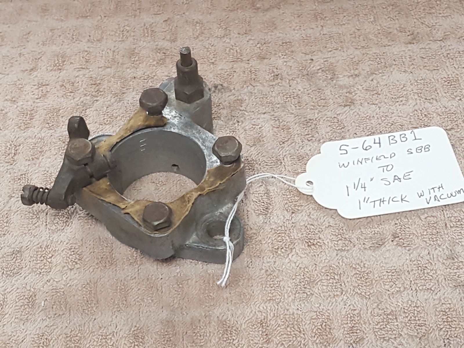 Original Winfield carburetor mount for S and SR models, has built in tap for vacuum to run vacuum tank windshield wipers gauge or whatever. Factory marked S64BB1 made for Winfield carbs size BB to fit to a manifold with 1 1/4" S.A.E. carburetor flange ( 2 bolts on 2 11/16" centers). Perfect condition $95 including domestic shipping.