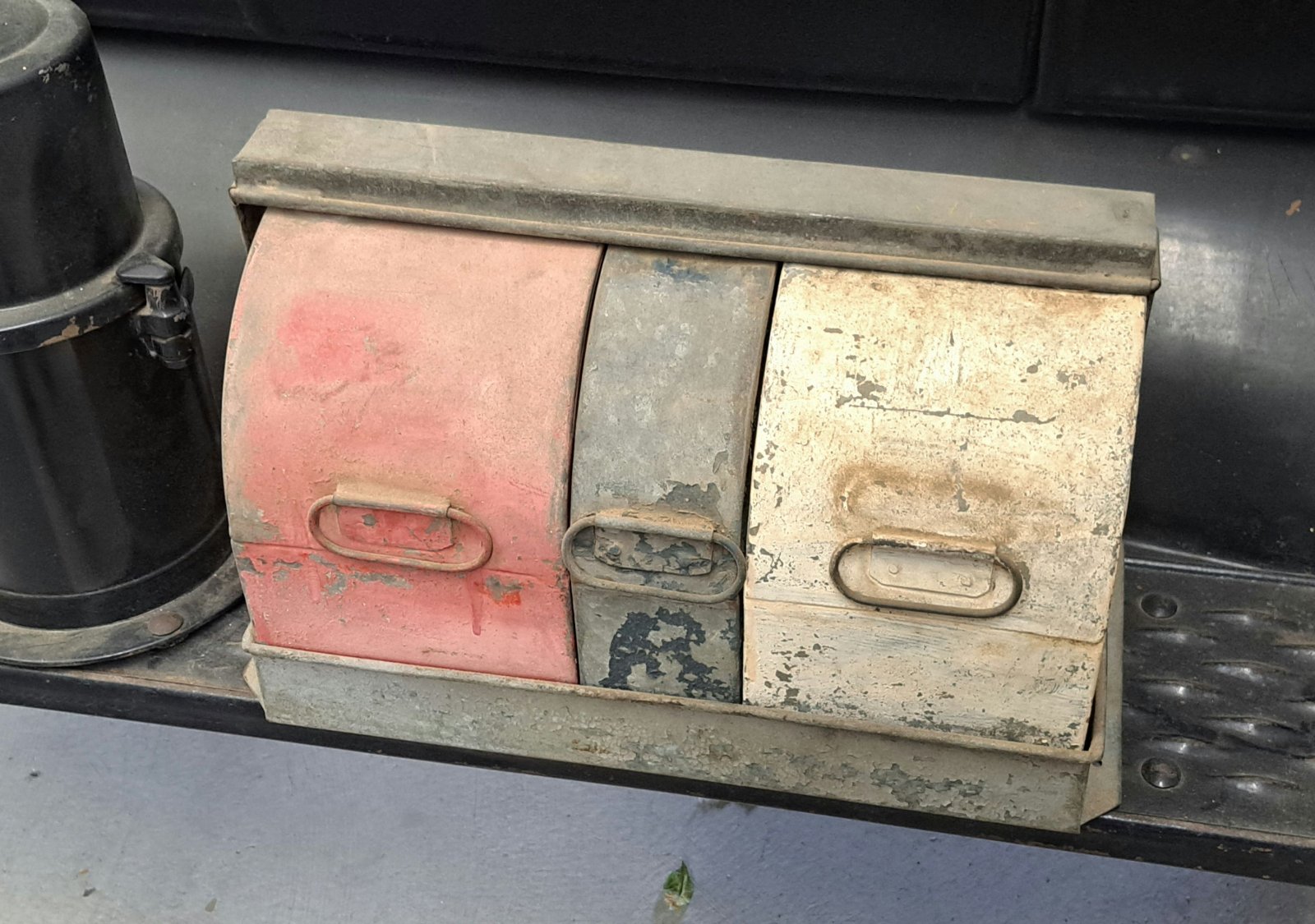 Running board gas, water and oil can set with lockable carrier. Cans are all in excellent condition and should hold fluid as intended. The set measures 10" Wide, 16 1/2" Length, 11" Height. Price is $300 plus domestic shipping. Mark Chaffin (951) 805-0928 SOLD