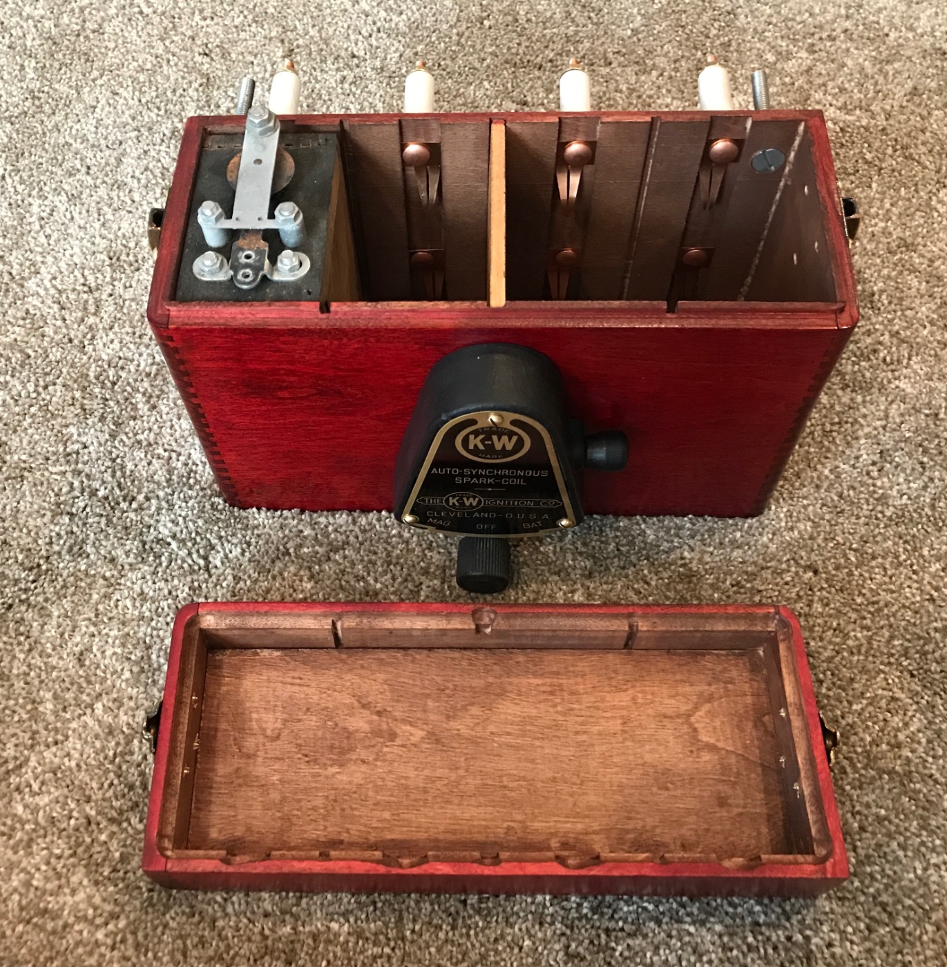 Reproduction 1912-13 slant top wooden coilbox. This coilbox is designed to hold the common later coils. It has a nice original 1913 KW switch, new faceplate, and new copper contacts, posts and insulators. New solid core wiring. It comes with two options for mounts, the installed and easily removed mounts that use 1/4 thread studs, and a pair of reproduction 5/16 thread traditional mounts are also included if you want to replace and install to your liking. The box is beautiful, with a rich stain and polyurethane. It is ready to mount and use. Perfect to replace the troublesome original coilbox and coils with a more reliable option with easily sourced coils for touring. 600 includes shipping.