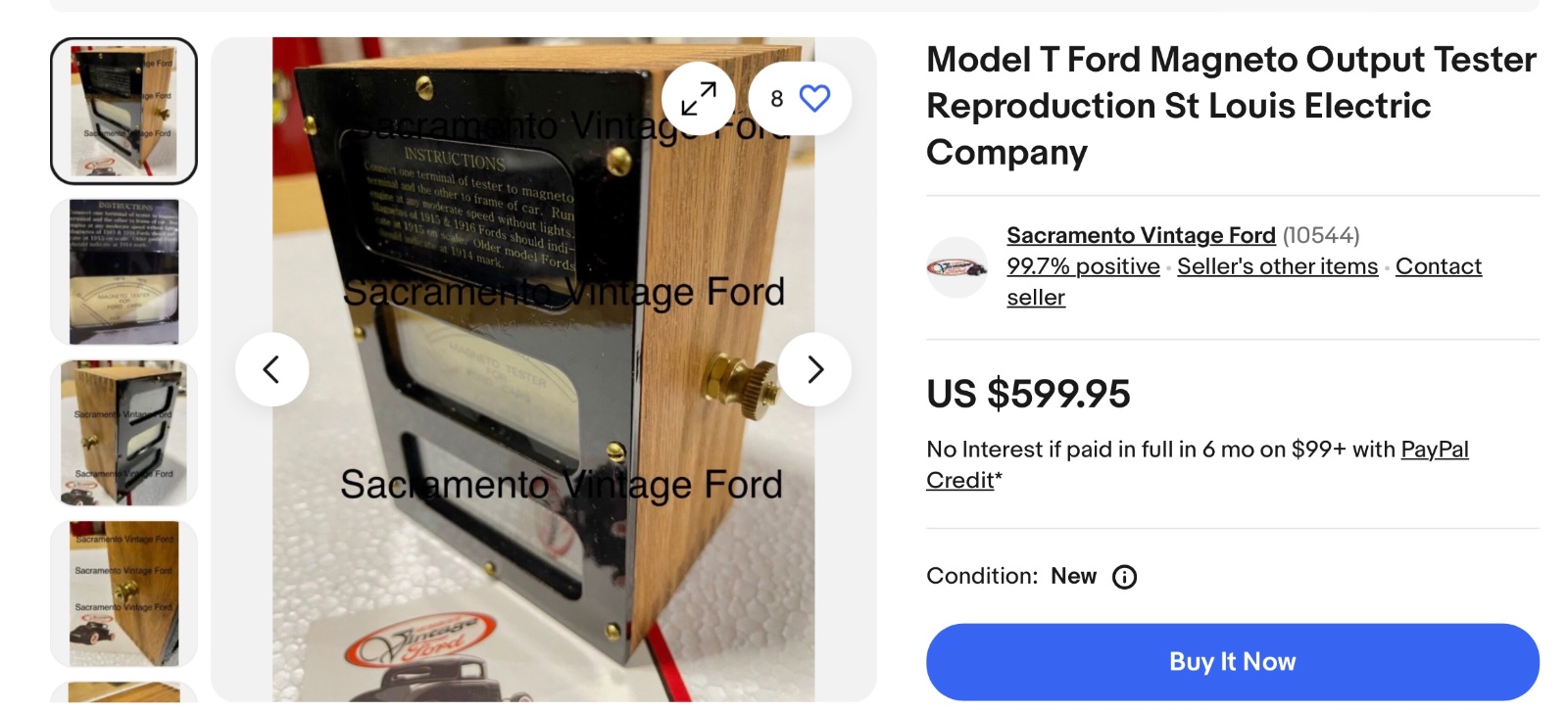 New, never used, still in the box, reproduction St. Louis Magneto Tester. Beautiful exact copy of a hard to find tool, exceptional woodwork, incredible reproduction. Includes directions/instructions. A must have tool for display or actual use. 375 includes shipping.