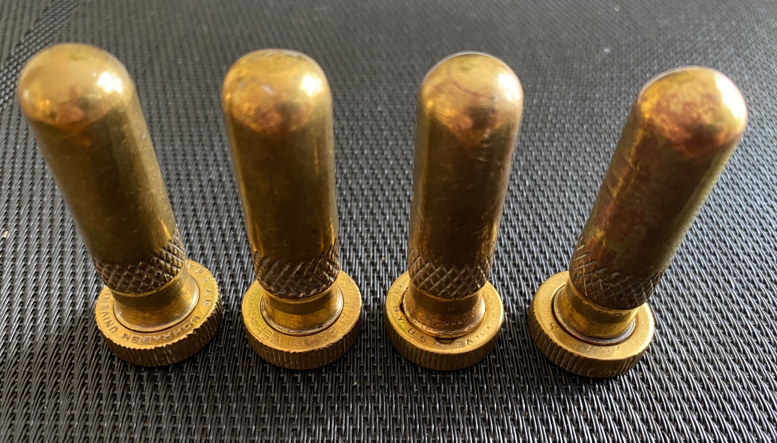 A very nice set of original Schrader brass era valve covers as pictured. $220 USD including freight.