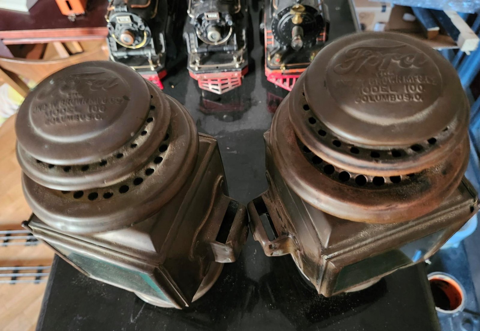 A nice, original pair of 1912 (maybe late 1911) Jno. Brown 100 sidelamps. They are "out of a garage" and have never been tampered with. There are some dings and dents. They are complete including four nice and good, original clear lenses, two nice red jewels, two burner assemblies, two thumb nuts/locks, etc. These are a really good pair of lamps. They could be used as-is on a nice original car or could be easily restored for a show car. Hard to find good, original early lamps.