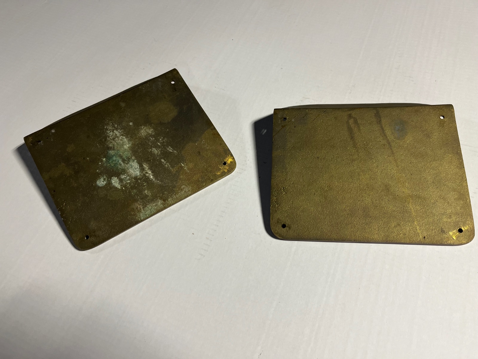 A pair of heavy brass Ford Script reproduction running board step plates. Never mounted or used. Some very minor buffing needed. $135.00 plus shipping for the pair.