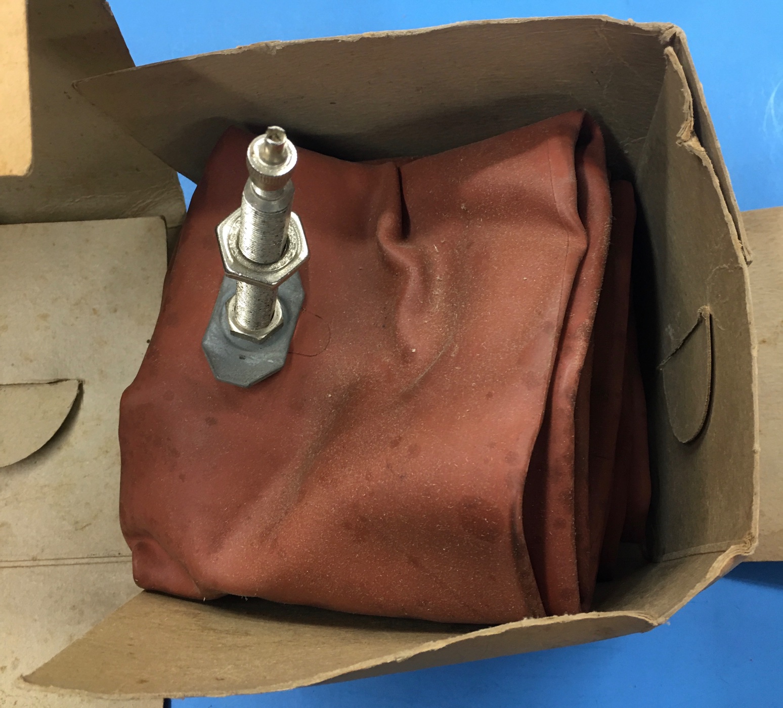 SOLD: Firestone Oldfield nos in box Red Rubber inner tube w/ Schraeder # 725 stem. Buy it as a vintage display item or for the NOS stem & hardware. The tube itself looks awful darn good, but no guarantee on a 100 year old inner tube! $25 & Free Shipping inside the USA. Email if you want it. Please do not post here or pm. Thanks.
