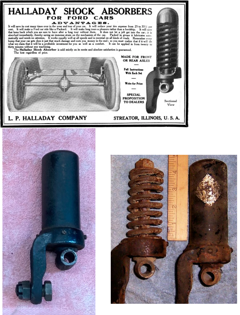 These appear to be HALLADAY shock absorbers. note the ad for the rear perch bracket is identical & has screws to hold the cylindrical cup on.